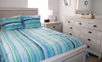The 1st bedroom upstairs has 2 sets of bunkbeds. And the other bedroom has a queen size bed. In the closets there are a few extra indoor folding chairs with comfy cushions and foot rests, should you need additional seating. There are also 2 queen size blow up mattresses, if additional beds are needed. Plenty of linens & towels are provided.