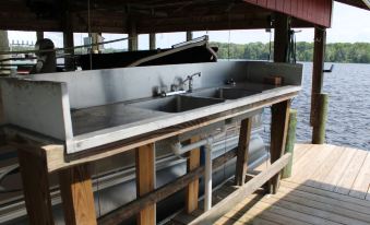 In the backyard overlooking the river you will find 2 docks, with electric, lights, water, a large fish cleaning station, and crab traps for you to use. Fish right from the dock, there are plenty of rod holders. If you bring your own boat, we have 1 covered boat slip with a boat lift you can use.