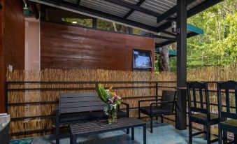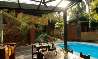 We loved our stay here. Family of 4. Kids 8 & 10. You have your own little modern style bungalow and it was comfortable and spacious enough for the 4 of us. Air conditioning and good hot water. A nice outdoor patio that felt somewhat private and had a good sized refrigerator for use. They have a pool and small restaurant which is nice if you don’t want to head out for food. It’s owned and run by a local family who were so nice and attentive. And very proud of what they’d built. They have two dogs that my children adored. And they were lots of iguanas and lizards and birds. Every day there is a pair of macaws that come to the property. It’s well located but you do need to go up a dirt road a ways to get to it. There wasn’t too much to walk to so it is a good idea to have a car.