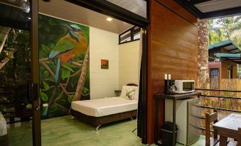 Having previously enjoyed our stays at Carlos' family's prior resort, we looked forward to booking his new venture in the same wildlife rich locale and were more than delighted with the cabins, pool, bistro, grounds and creek access - an oasis in the forest. Everything was new and tastefully designed (and painted) and we reveled in all the extra room provided by our covered front patio. On our second day my wife had a medical episode and Carlos, always treating us as family, expedited us to the nearest private clinic to attend to our emergency. Sadly, we had to miss two nights stay and 'young Carlos' waited several hours for our late return on the fourth night to ensure our cabin access and to inquire about my wife's health. True concern, genuine people, great people, and a wonderful new resort. Without through traffic even better for watching toucans et al and one rainy season later the resort will be even more lush. Grateful for the help and hope we can have an uneventful return. Ross and Sandie