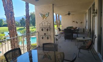 Tastefully remodeled 2 br 2 ba condo with huge patio overlooking pool, spa, golf course and mountains. Gated community with large green space, tennis/pickleball courts, exercise room and more. Across the street from Annenberg estate, near corner of Bob Hope and Frank Sinatra Drive. Serene and peaceful.About pets:No pets allowed.About checkOut:Check out before 11:00 AM.About children:Children allowed: ages 0-17.About checkIn:Check in after 4:00 PM.About smoking:Smoking is not permitted.About minBookingAge:Minimum age to rent: 21.About events:No events allowed.