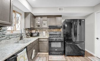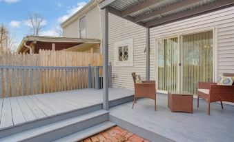 There are three bedrooms upstairs. One has a queen size bed, a full bed, and a twin-size and full bunk bed. You can also use the fold-down sleeper sofa in the living room or inflate a twin air mattress. There is a full bathroom upstairs and a half on the first floor. laundry, living room, dining area, and kitchen with necessary cooking amenities. Outdoor seating is provided on the back patio—About pets:No pets allowed.About checkOut:Check out before 11:00 AM.About children:Children allowed: ages 0-17.About checkIn:Check in after 3:00 PM.About smoking:Smoking is not permitted.About minBookingAge:Minimum age to rent: 21.About events:No events allowed.