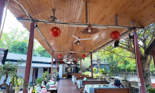 路南邊圍牆和竹子圍住院落,有廚房餐枱加幾間客房,每間客房有自己的名字,錯落有致分佈,有碎石和花圍住,既安全美觀又有私密性,客房和廚房餐枱有牆隔開,牆裝飾的很漂亮,橫着嵌入了一些瓦罐和燈,瓦罐裏種了綠植,很有美感。院落中間有個架子放了很多多肉。餐枱在和廚房相連的走廊長亭,有五六張桌子,點餐上菜很方便,而且很通透,邊吃飯邊賞景。旁邊有沙發,常有客人坐那逗老闆家的狗狗 拉布拉多温順可愛不怕人。院子裏有地方停車,還有一排包間和一個透明玻璃的大餐廳。