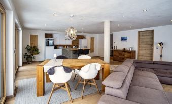 The 61 m² kitchen / living room is the centerpiece. To the southeast and west, large panoramic windows are built in, which allow an undisturbed view of the mountains. It is equipped with a modern Zeyko kitchen with island and bar and has an induction hob, oven, fridge and freezer, a fully automatic coffee machine and a dishwasher. A basic equipment for cooking, as well as the most necessary cooking utensils such as spices, oil etc. are of course available.