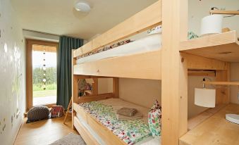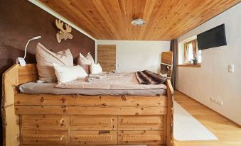 The 7 m² room contains a bunk bed with 1.00 x 2.00 m bed made of local spruce from a carpenter and blackout curtains. For the little ones, of course, we have games such as Uno, the buck, puzzle, a magnetic and painting board, building blocks, coloring books with crayons and felt pens. In winter we provide a sledge.
