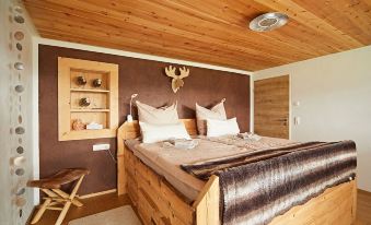 The 15 m² bedroom with a 2.00 x 2.00 m double bed made of local spruce from the carpenter has a stone pine ceiling, which has a positive influence on the physical and mental well-being, since the heart rate is reduced, which improves the quality of sleep. A 43 inch 4K Ultra HD Smart TV is also available. In summer, blackout curtains offer the possibility to darken the room and sleep better.