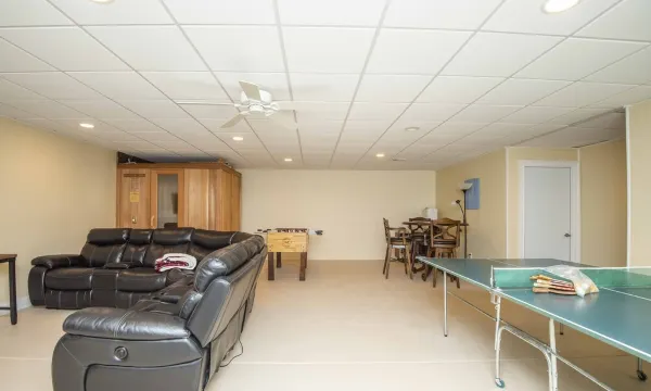 Property highlights include a large lot in a private setting, a three-car garage, extra parking, and plenty of room for a boat trailer. The home's interior offers beautiful décor, furnishings, a fully equipped gourmet kitchen with a massive island, and a fabulous two-story great room with a wall of windows overlooking an oversized screened porch with a vaulted ceiling and two open decks. The spacious main-level primary bedroom suite has a spa bath, a walk-in tiled shower, and two water closets. The finished basement features a rec room with a large sectional sofa, a foosball table, a ping pong table, a gaming table with chairs, and a variety of board games, plus a large bedroom and full bath. The upper level has a large bonus room with two daybeds/trundles and four oversized bean bags, making a perfect retreat for kids to hang out—a loft area with a laptop-friendly workspace and two additional bedrooms connected to a full bath.