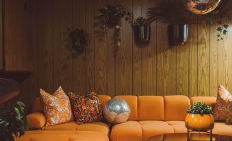 * A 70's inspired basement recreation room with pool table, darts, piano, bar and lounge area complete with disco ball!