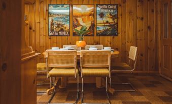 The kitchen is well-appointed with retro-style appliances, a refrigerator, dishwasher, range oven. The space is equipped with all the essential cooking tools and utensils. There’s also a cozy nook perfect for casual breakfasts or coffee.