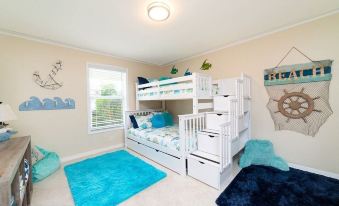 The third bedroom features a fun bunk bed arrangement with wide stairs (that double as storage) leading up to a twin bunk that's atop two full-size beds.