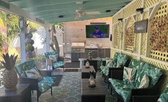 • Tiki-themed covered patio with seating, ceiling fans for shade