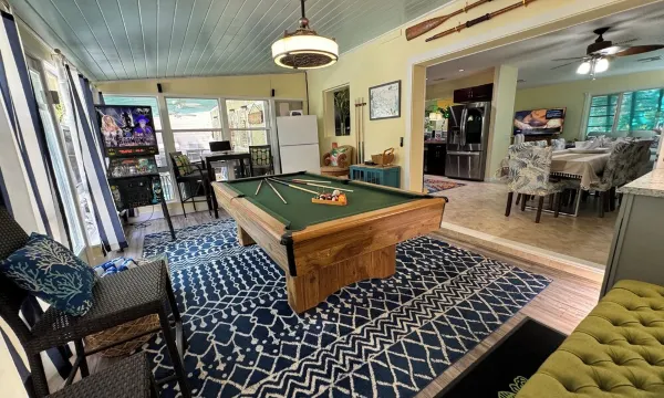 • Game room with regulation pool table, pinball arcade, and wet bar