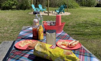 Outside, we have created a cozy backyard (and front yard) retreat. Gather around the fire pit on cool evenings, roast marshmallows, and share stories under the starlit sky. The crackling fire and the strings of lights will provide the perfect ambiance for relaxation and connection. For some friendly competition we have included some out door games or bring your own. Engage in spirited matches with your friends and family showcasing your skills and having a fantastic time together.