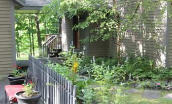 Outdoor Oasis: A wraparound deck connects to a perennial garden with a flagstone path, perfect for relaxing or entertaining.