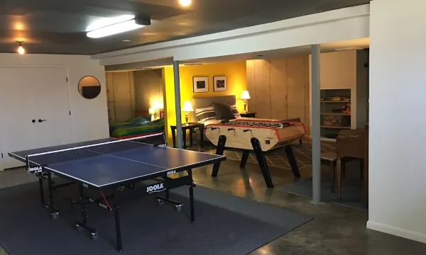 Basement Recreation: Features a premium Cornilleau ping-pong table, Bonzini foosball table, Brio train tracks, and Legos for endless indoor entertainment.