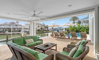 The spacious outdoor patio is designed for relaxation and entertainment. With ample wicker seating featuring plush green cushions, the space is perfect for unwinding with a morning coffee or enjoying evening conversations with friends and family. Overlooking the sparkling canal and pool, the patio is surrounded by lush greenery, creating a private oasis for your getaway.
