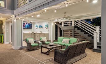 The vaulted ceilings and shiplap-paneled walls enhance the room's airy, coastal charm, adding warmth and elegance. The open-concept design connects the living area to the kitchen and dining spaces, ensuring everyone can gather together while still enjoying their activities. From the adjacent patio, guests can step outside to enjoy the fresh breeze while overlooking the canal and pool below.