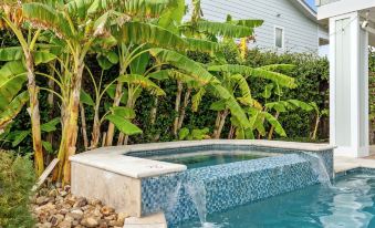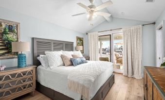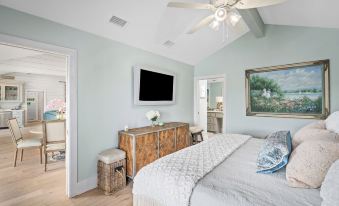 This guest room includes a cozy queen bed and offers serene views of the canal and pool. A peaceful retreat, it is located on the canal side of the house, perfect for guests seeking relaxation.