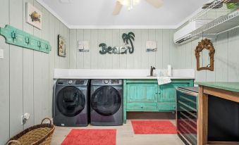 Located upstairs, the living area offers a cozy and sophisticated retreat designed for comfort and connection. Anchored by a plush turquoise sectional, it provides ample seating for families or groups to gather and unwind after a day of adventure. Whether you’re streaming your favorite shows on the 65” LG Smart TV or simply enjoying good company, this space is perfect for creating lasting memories.
