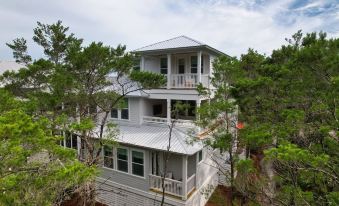 ABOUT THE HOME: This three story Florida Cottage is beautifully designed and has a grand facade with porches on every level for all bedrooms except the bunk room. The light open concept is inviting with airy 10 foot ceilings. The gourmet kitchen is perfect for large groups and entertaining. The kitchen also features a wet bar including a wine fridge and ice maker. With 5 bedrooms and 4.5 bathrooms, this coastal beauty can comfortably sleep 14 guests.