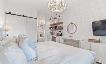 A plush king bed, bunk beds and a 65’ flat panel television. The kitchenette is equipped with granite countertops, a Keurig coffee maker, toaster, microwave and bar refrigerator. The bathroom features a shower and well-lit oversized vanity and blow dryer. Wireless high speed Internet service and cable television are included. We also provide beach towels!