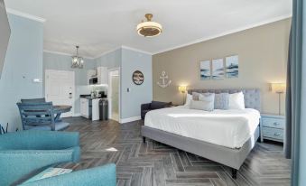 A king bed and a twin pull out sofa bed. The unit was completely renovated to meet the needs of a couple “plus one.” The kitchenette is equipped with granite counter tops, a Keurig coffee maker, toaster oven, microwave and bar refrigerator.