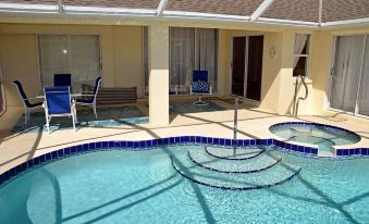 Both the living and dining rooms feature multiple panel sliding doors which open to the lanai. The southern exposure of the pool provides sun all day long. Relax in the hot tub overlooking the pretty fresh water pond. You may even see an alligator or turtles floating around. Enjoy the sun loungers, pool toys, outdoor table and seating, morning, noon and night.