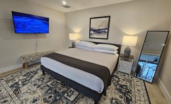 The living room area is quite spacious with plenty of natural light. There is a queen pull out sleeper sofa and a couch. You will find many games and a variety of books in the corner bookshelf. The oversized coffee table doubles as a gaming table as well. Additionally there is a 70” wall-mounted smart TV with Netflix provided for your enjoyment.