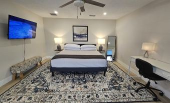 #1 MASTER. This room has a king sized bed and a 50” wall-mounted smart TV with Netflix provided for your enjoyment. The king mattress has a plush top and quite comfortable. Additionally, there is a dedicated workspace and chair. There is a his/her closet with plenty of hangers and storage space. You will find a pack and play and highchair in this area and (4) blow up mattresses (2 full & 2 queen). The en suite bathroom has a double vanity and a standing shower. The lanai/pool area can be accessed directly through the sliding door.