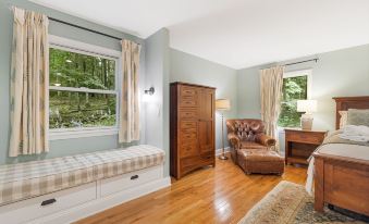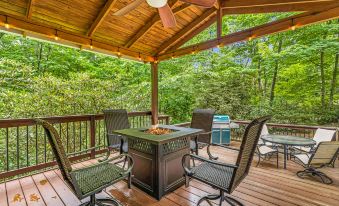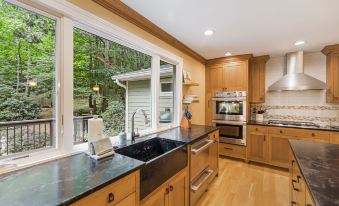 Driving into the private community of Glen Arden Estates, located just south of downtown Asheville, you'll find a secluded neighborhood with desirable homes on wooded lots. Tranquil Nest AVL features a woodstove in the living room, perfect for cool nights where good company and the warmth of a wood fire will soothe the soul. A lower-level living area with a smart TV and gas fireplace gives your group an extra gathering room. This elegant home also boasts a modern, gourmet chef’s kitchen that is suitable even for the most discerning chef, featuring soapstone countertops, Fisher & Paykel stainless steel appliances, two ovens, a wine cooler, and custom Mission-style oak cabinetry. The outdoor dining table on the covered deck allows you to enjoy family meals surrounded by nature. For the talented Grillmaster in the group, this outdoor space provides a green egg grill and a gas grill to create the perfect combination of flavors. After dinner, unwind with a walk through the neighborhood, build a fire in the private backyard fire pit and toast marshmallows, or take a trip to Asheville and check out the artsy and unique downtown area! There's no better way to end the day than with a deep soak in the clawfoot tub.