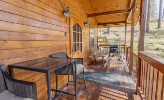 The exterior area of this home boasts gorgeous views and unrivaled privacy. A deck leading from the lounge looks out to tall pines, allowing you to appreciate the breathtaking views from this exclusive cabin. Lounge in the sun on your viewing deck. A quaint seating area and BBQ are situated on the deck of this lovely home for use during your stay.