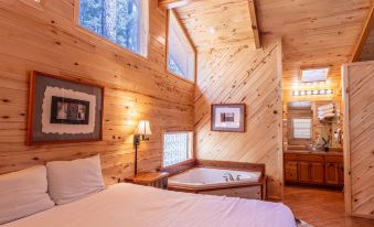 This gorgeous mountain hideaway accommodates 2 guests in a bedroom. The bedroom is on the main level of the home and is fitted with a king-size bed.