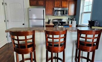 Step inside through the screened-in porch, the perfect spot to enjoy your morning coffee or unwind while taking in the peaceful sights and sounds of the river. The living room provides a warm and welcoming space with a pull-out couch and an electric fireplace, ideal for relaxing after a day of exploring. The fully stocked kitchen opens onto a side patio, complete with a gas grill, a dining table, and extra seating, making outdoor meals a delightful part of your stay. A half bath and a convenient laundry area round out the main floor.