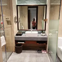 Удобства в номере относительно полные. На балконе есть ванна и одноразовые банные принадлежности, но ими не пользовались, потому что ночью было холодно. Кроме того, есть несколько вариантов подушек. Вы можете попросить на стойке в соответствии с вашими потребностями. В холодильнике есть бесплатная вода и газировка, которые будут пополнены вовремя на следующий день.