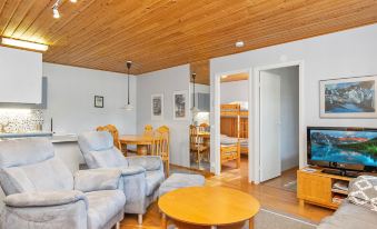The two bedrooms in the apartment will ensure a good night's sleep. One bedroom has 2 beds with a shared mattress. The other bedroom has a bed and a bunk bed.
