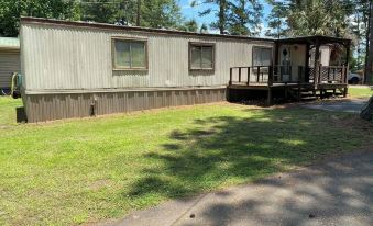 Mobile Home #4 at Tranquility Bay Resort includes: 3 Bedroom (Room 1: 1 king bed; Room 2: 2 queen beds; Room 3: 2 full beds), Full Kitchen & Living Room, 2 Full baths, and Patio across the front of the mobile home. Sleeps 10.