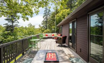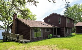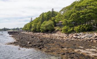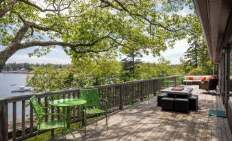 Moving off the dining area into the living room with its vaulted ceiling, large windows, and retro decor invites you into this warm open space. Your family will enjoy the comfortable sectional sofa, where every seat has the best view, two cushioned armchairs, and a 40" flat-screen television, with cable and a DVD/Blu-ray combo, perfect for a family movie night, and is complete with a woodburning fireplace for those chilly Maine evenings. Through the sliding door, you step out onto an oceanfront deck spanning the entire length of the house and overlooks the harbor and islands. The deck is equipped with a propane grill, a wicker lounge set and extra chairs, a fire pit, and bistro tables for relaxing and watching your family play on the lawn with some of the games provided, such as ladder ball, bocce ball, lawn darts, or bean bag toss, which can be found in the hallway closet. From the side lawn, and stone steps you will find access to the rocky Maine coast. We suggest wearing shoes as the Maine coast can be a bit rugged, and steep, but it is worth the quick adventure to dip your feet in the surf and enjoy finding sea creatures in the tide pools and seaweed.