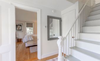 Heading upstairs you will find the second bedroom, which has a comfy full-sized pillow-top bed. In addition, the room has two end tables, lamps, a large dresser, and a window with a harbor view. This picture-perfect room will wake you up with a beautiful view of the Port Clyde fishing town as busy lobstermen head out for the day first thing in the morning. The next upstairs bedroom has a beautiful vanity dressing table, a full-sized bed with a pillow-top mattress, and an end table with a lamp and a dresser. This room has a private deck with Adirondack chairs to enjoy the evening air and the water view. It is also the ideal spot for a glass of wine after putting the kids to bed. Here on the second floor, there is a second bathroom, equipped with a bathtub and shower, toilet, and a vanity sink with a mirror. In addition, there is a linen closet right outside of this bathroom with good storage space for any extra towels. The final bedroom has two twin-sized beds, a shared nightstand, and a floor lamp. In addition, this room has a dressing table with a mirror, as well as a dresser. This room is perfect for those who might enjoy sharing a room for a fun sleepover.