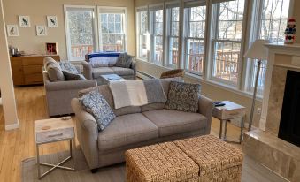 An expansive deck is the heart of the home, where you can grill, sip a drink, and watch boats pass as the sun sets. A bright sunroom offers a cozy space for reading, games, or conversation.