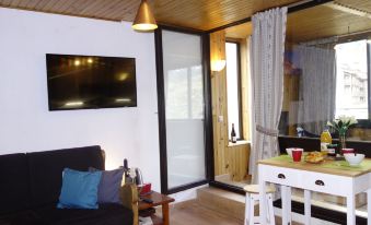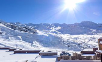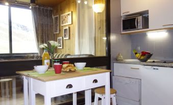 Simple residence "Le Sérac", 10 storeys. Above Val Thorens, in the district of Péclet, in the centre, 800 m from the lake, 50 m from the skiing area. In the house: WiFi (extra). Lift, central heating system. In Winter: please take snow chains. Public car park at 200 m, extra. Shop 100 m, grocery 150 m, supermarket 150 m, shopping centre 100 m, restaurant 50 m, bar 250 m, bakery 150 m, café 50 m, pedestrian zone 100 m, 5 minute walk to the centre, bus stop "Navette Gratuit" 100 m. Skisport facilities 100 m, slopes 50 m, ski rental, ski bus stop, ski school 150 m, ski-kindergarten 50 m, ice rink, children's playground. Well-known ski regions can easily be reached: 3 Vallées. Well-known lakes can easily be reached: Lac du lou 1 km, Lac Du menuieres 800 m. Please note: entertainment in the season. The owner does not accept any groups. In case of good snow conditions, the house is accessible on skis. "Sérac A10", 1-room apartment 20 m2 on 10th floor. Bright, partly renovated in 2022, very beautiful and romantic furnishings: living/dining room with 1 double sofabed (1 x 140 cm, length 190 cm), TV (flat screen), electric heater. Small, Bay window with veranda, window onto the living room with 1 sleeping facility (1 x 90 cm, length 190 cm). Kitchenette (dishwasher, 2 ceramic glass hob hotplates, kettle, microwave, electric coffee machine, Capsules for coffee machine (Nespresso) extra) with dining nook. Shower/WC. Electric heating, Electric fireplace. Parquet floors. Very beautiful view of the mountains and the ski run. Facilities: Internet (WiFi, extra). Please note: non-smokers only. Maximum 1 pet/ dog allowed. Smoke alarm. 73257007928HT
