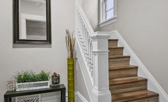 This place was fine, not as great as described.The air return had such an unbelievable, never seen anything like it, accumulation of black hair and dirt that it looked like a muppet trying to reach through.Lots of dust on baseboards, shelves, chair bases. Cobwebs in corners. Walls super scuffed up. Microwave door, Keurig and stove panel dirty. Fridge, kitchen sink and countertops were clean. Bathroom sink and toilet were clean. Shower/tub clean enough-old fixture maybe can't look cleaner, did have newer surround.The towels seemed laundered, but also like it had been a while since.Very noisy late evening-slamming doors, music, cars etc. Quiet by midnight, fine until morning. Comfy bed.Street parking was fine. Old house, run down outside but ok.K-cups, to-go coffee cups, basket of treats and mini fridge with water, soda, juice bags – a nice touch.Not bad enough to boycott, but definitely needs outdoor stair repair/replacement, as well as a refresh and professional cleaning.