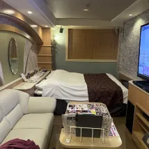 Кровать огромная, а ванна не только большая, но и по-настоящему роскошная. Массажное кресло также великолепно, есть *** и караоке.