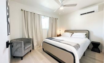 Bedroom #1 has a queen bed. side tables, lamp, black out curtains, large window, ceiling fan and Mini split that provides heat/air. Closet with hangers and a small dresser for clothing.