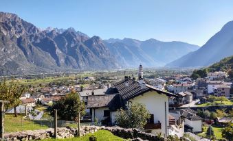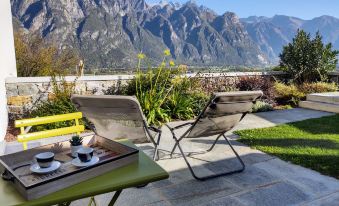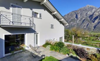Modern 2-family house "Ronscione Bellavista". In the district of San Pietro 9 km from the centre of Novate Mezzola, 14 km from the centre of Chiavenna, 90 km from the centre of Como, in a quiet, sunny, elevated position, 10 km from the lake, in the countryside. For shared use: property 7'000 m2, large, well-kept terraced garden (not fenced) with lawn and trees. Private: garden 60 m2. In the house: storage room for bicycles. Storeroom available. 200 m long steep, narrow motor access to the house. Stepped path to the house. Parking on the premises. Supermarket 500 m, restaurant 1 km, bar 1 km, bus stop 650 m, railway station "Novate Mezzola" 10 km, sandy beach "Lido di Novate" 10 km pebble beach "La Punta (Lago di Como)" 20 km. Walking paths from the house 20 m, cycle lane 1 km. Nearby attractions: Cascata di Boggia 6 km, Torre di Segname 3 km, Chiavenna 9 km, casa Pipeta. Well-known ski regions can easily be reached: Madesimo 28 km. Well-known lakes can easily be reached: Lago di Mezzola 10 km, Lago di Como 20 km. Hiking paths: Sentiero Valtellina, Sentiero Tracciolino. Object suitable for 2 adults + 2 children. Please note: the owner lives in the same residence. 2-room apartment 50 m2, on the ground floor. Comfortable and modern furnishings: open living/dining room with panoramic window with 1 sofabed (130 cm, length 190 cm), dining table, TV and air conditioning. Exit to the patio. 1 double bedroom. Kitchenette (oven, dishwasher, 4 induction hot plates). Shower/WC. Floor heating. Wooden floors. Large patio. Terrace furniture, deck chairs (2). Very beautiful panoramic view of the mountains and the valley. Facilities: washing machine, children's high chair, baby cot for up to 2 year olds, hair dryer. Internet (WiFi, free). Parking (fenced 1 car). Please note: non-smokers only. Private entrance, fire extinguisher. IT014057C24OV8OLDN