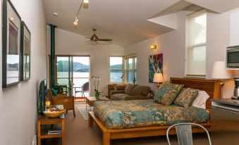 Gaze at stunning views down East Sound from this beautiful studio condo perched right on the shore! SeaStar Lofts offer the only accommodations directly on the waterfront right in the heart of Eastsound Village, with waves lapping at your doorstep. The Leeward Studio is one of four guest apartments in the brand new Main Street Station, designed to complement beloved historic structures of Eastsound. This is a premium unit, with spacious open floor plan of 430 square feet, queen bed, pull-out sofa, fully equipped compact kitchen, view balcony, and nearby stairs to the gorgeous rocky beach. Architecturally crafted with attention to every detail, and all new furnishings in coastal, organic style we call 'beachy elegance.' The rooms highlight natural textures and products from local artisans. In Eastsound Village you will find all you need -- farmer's market, bookstore, kayak rentals, bicycles, grocery, natural foods, boutiques, gift shops, and more. In fact, you don't even have to bring a car! Skip the ferry lines and pack light, take a shuttle or taxi to Eastsound, and the rest of your trip is easy. Feel free to ask us for any other special details you may desire for your get-away. Simply the perfect spot for your Orcas Island adventure! This unit can adjoin to our Windward Studio for two couples or families that want more room. (See VRBO listings 419265, 420673 and 418375 for more options and group . Please note that we thoroughly disinfect our units between guests.About pets:Pets allowed.Pets may NOT be left unattended in unit..About checkOut:Check out before 11:00 AM.About children:Children allowed: ages 0-17.About customRules:For pet owners: no evidence of pets on furniture, towels or quilts; evidence of pet hair or stains will result in an additional charge..Prior to departure please strip beds, do all dishes and tidy up.,Please be a courteous neighbor. No loud noise..About checkIn:Check in after 3:00 PM.About smoking:Smoking is not permitted.About events:No events allowed.