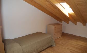 In the attic it offers a bedroom with double and single bed. Covered parking place in garage.
