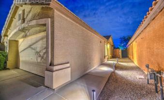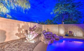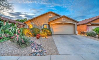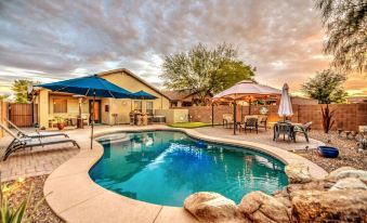 Welcome to your dream vacation retreat! Just 45 min south of Sky Harbor Airport lies our serene oasis. Nestled in a desert scaped backyard, you'll find a private pool complete with a soothing waterfall, perfect for unwinding under the sun. Adjacent is a BBQ bar area for al fresco dining and a gazebo with a cozy conversation set, ideal for evening gatherings. Sharpen your putting skills on the private green before cooling off in the pool.