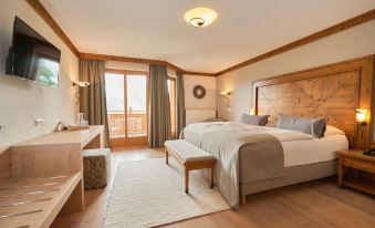 This was the first time I had stayed in the Alpendorf in the Summer, it was spectacular. So beautiful. The hotel is lovely, set in picturesque grounds, with a large indoor pool and a great natural outdoor pool. We went there as a family for our Son’s wedding. The staff could not have done more for us. We were a group of 30 and they catered for our every wish. The room we had was very good with a separate double bunk room for our grandson. The bed was very comfortable and had lovely soft pillows. There was a large roof terrace with a superb view of the mountains. The food was delicious and we were not over faced by huge plates of food that got wasted. The evening meal was a 5 course meal. There was a child’s menu and they catered for the children eating earlier than us adults. There was so much to do and see. There are animals for the children a kids club with staff that speak several languages. My only thought was that in the winter I would have preferred a room with a bath, but for the summer a shower is fine. All in all we all felt that the hotel and its staff were amazing. Thank you all so much. I could not recommend it more highly, we will be back.
