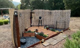 -The meadow room, built from the tops of redwood trees and a floor of Santa Fe slate is surrounded by beautifully maintained landscaping. There is a fully screened fire pit with this roasting rack to melt dessert or grill the late-night bite.