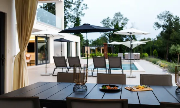Very beautiful, luxurious house "Villa Sonia", 2 storeys, surrounded by trees and fields. In the hamlet Tomažići 4 km from the centre of Labin, in a quiet, sunny position, 10 km from the sea. Private: property 1'600 m2 (fenced) with wildlife garden and trees, swimming pool angular, heated (4 x 10 m, 45 m2, depth 135 cm, seasonal availability: 01.Apr. - 30.Sep.) with internal staircase and salt-electrolysis pool-cleaning system. WC in the pool area, outdoor shower, hot tub, terrace (40 m2), garden furniture, barbecue, children's playground, pool maintenance by the owner/gardener. In the house: internet access, sauna (all included), central heating system, air conditioning, washing machine, tumble dryer. Parking (for 4 cars) at the house on the premises. Shop 2 km, supermarket 2 km, restaurant 2 km, bus stop 2.2 km, pebble beach 10 km. Please note: airfield 45 km from the property. By groups of young people double deposit is requested on arrival. Swimming pool heated (extra). It is necessary to announce 7 days in advance if the pool heating is required. Video surveillance of the driveway and parking. 5-room villa 280 m2 on 2 levels. Very beautiful and luxurious furnishings: large living/dining room with satellite TV. Exit to the terrace, to the swimming pool. 1 room with 1 french bed (200 cm, length 210 cm), shower/WC and satellite TV. Exit to the garden. 1 room with 1 french bed (180 cm, length 210 cm), shower/bidet/WC and satellite TV. Exit to the terrace, to the swimming pool. Open kitchen (oven, dishwasher, 5 induction hot plates, toaster, kettle, microwave, freezer, electric coffee machine). Exit to the terrace, to the swimming pool. Shower, sep. WC. Underfloor heating. Upper floor: 1 room with 1 french bed (200 cm, length 210 cm), shower/bidet/WC and satellite TV. Exit to the balcony. 1 room with 1 french bed (200 cm, length 210 cm), shower/WC and satellite TV. Exit to the balcony. Floor heating, forced-air heating. Large balcony 30 m2, terrace 15 m2, roofed. Terrace furniture, balcony furniture, deck chairs. View of the countryside. Facilities: safe, iron, hair dryer. Internet (WiFi, free). Please note: non-smoking house. Fire extinguisher. Available: wine-cooler, 2 x ceramic heated lounger. One bedroom on the ground floor and pool area adapted for people with disabilities.
